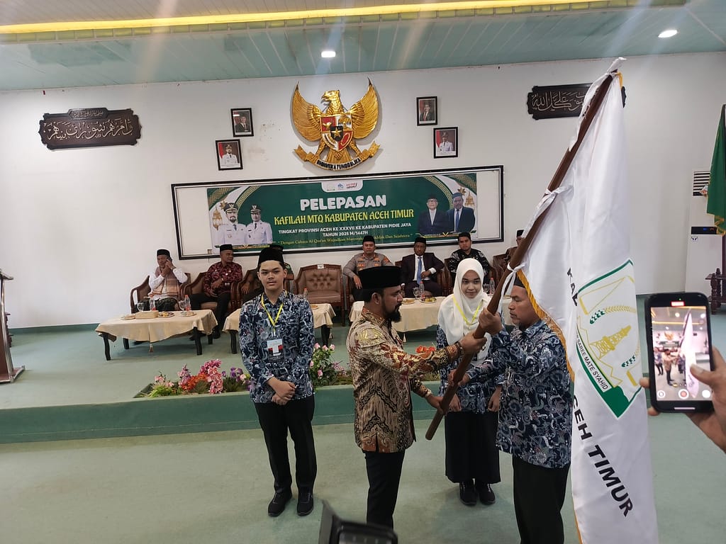 Aceh Timur – Bupati Aceh Timur melepas 58 Kafilah Kontingen Musabaqah Tilawatil Qur’an (MTQ) Aceh Timur yang akan berlaga di Tingkat Provinsi Aceh di Kabupaten Pidie Jaya, Pelepasan kontingen MTQ Aceh Timur kamis 30 Oktober 2025, itu berlangsung di Aula Pendopo Bupati, Para peserta yang akan berlaga ditingkat Provinsi Aceh itu sebelum dilepas terlihat membaca doa bersama Mereka berdiri satu pasukan bersamaan dengan pasukan lainnya.