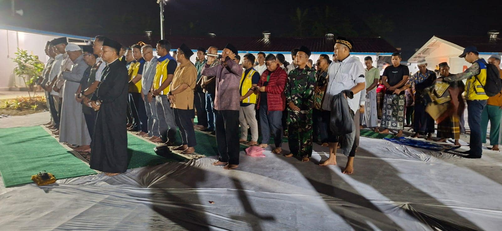 LENSARAYA | Aceh Tamiang – Komandan Komando Rayon Militer (Danramil) 02/Krb (Karang Baru), Kapten Inf Faisal Hadi sahur dan Sholat Subuh berjama’ah bersama warga pengungsian di Hunian Sementara (Huntara) II Dusun Impres Desa Bundar, Rabu (26/02/26).