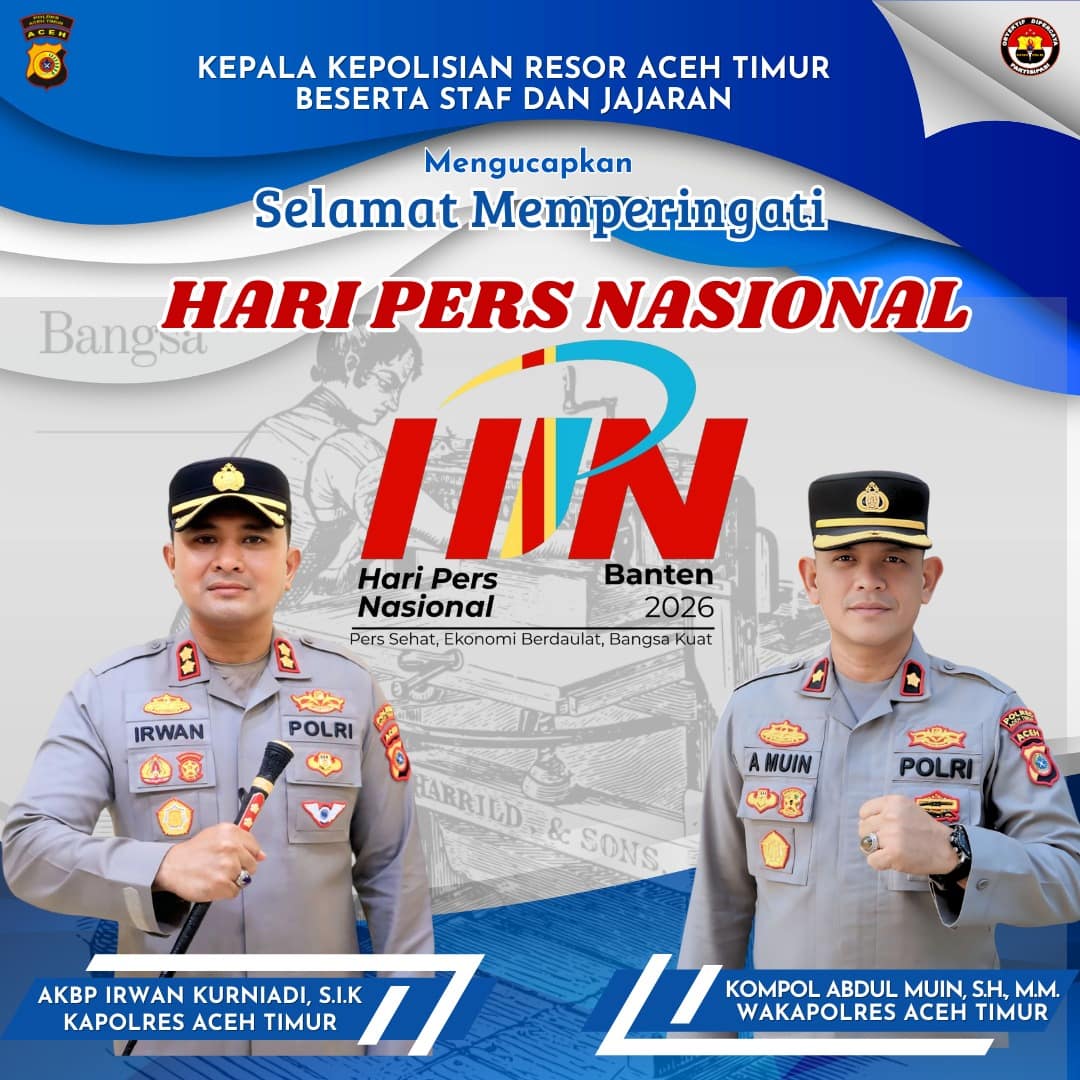“Atas nama pimpinan dan seluruh anggota Polres Aceh Timur dan jajaran, saya mengucapkan Selamat Hari Pers Nasional 2026. Kami juga sangat mengharapkan masukan, kritik yang membangun, serta peran aktif insan pers dan tokoh masyarakat, agar Polri semakin mantap dalam meningkatkan kinerja dan pelayanan kepada masyarakat,” ujar AKBP Irwan Kurniadi, S.I.K. Senin, (09/02/2026).