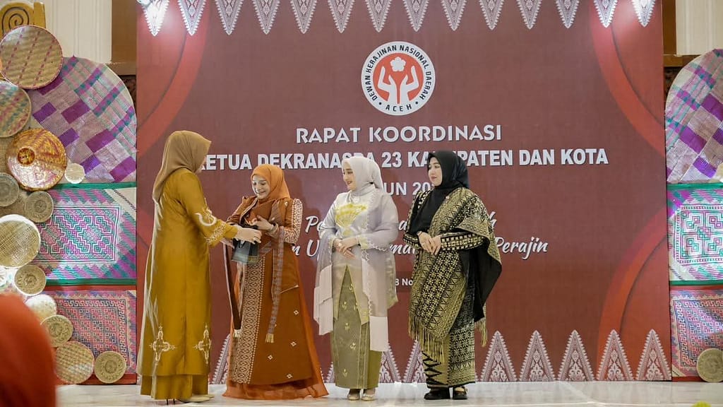 Penghargaan tersebut diserahkan langsung oleh Ketua Dekranasda Aceh, Ny. Marlina Muzakir, pada kegiatan Rapat Koordinasi Ketua Dekranasda 23 Kabupaten dan Kota se-Aceh yang berlangsung di Hermes Hotel Banda Aceh, Sabtu (8/11/2025).