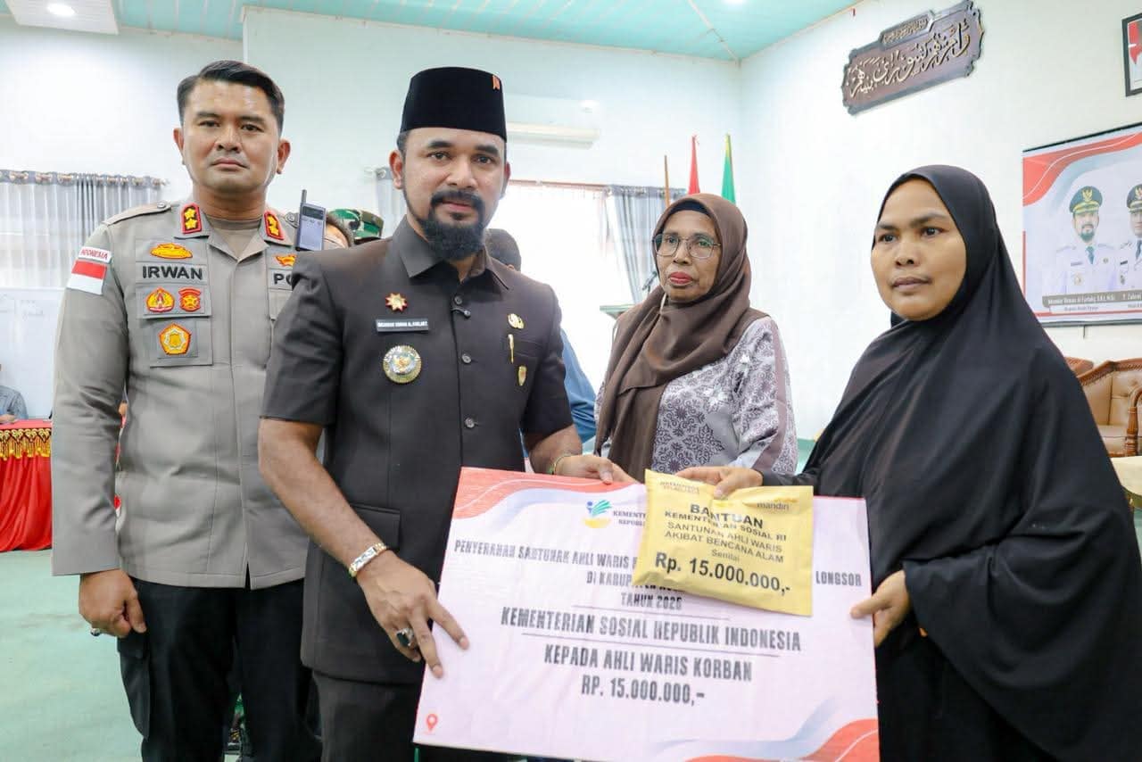 LENSARAYA | Aceh Timur — Bupati Iskandar Usman Al-Farlaky, S.H.I, M.Si menyerahkan santunan kepada ahli waris korban bencana alam banjir dan longsor di Kabupaten Aceh Timur. Penyerahan santunan tersebut berlangsung di Aula Serbaguna Pendopo Idi, Kamis, 29 Januari 2026.