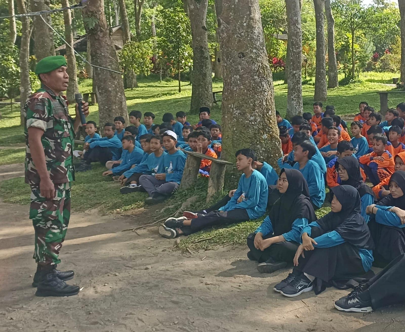 Blitar – Dalam menanamkan semangat cinta tanah air sejak dini, Bati Komsos Koramil 0808/02 Garum Pelda Slamet R memberikan materi pengenalan Bela Negara kepada peserta perkemahan SD IT Alhikmah Kelurahan Bence. Kegiatan ini dilaksanakan di kawasan wisata Bon C perkebunan Petung Ombo Desa Karangrejo Kecamatan Garum Kabupaten Blitar, Kamis (9/10/2025).