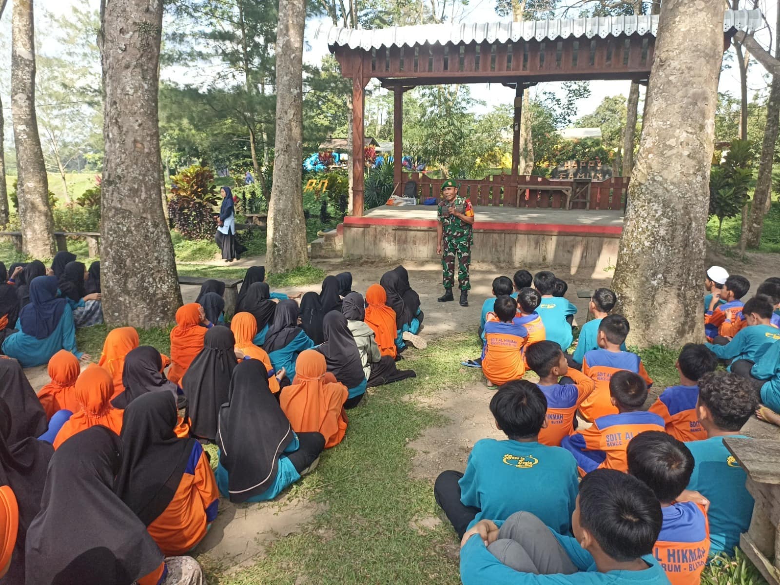 Blitar – Dalam menanamkan semangat cinta tanah air sejak dini, Bati Komsos Koramil 0808/02 Garum Pelda Slamet R memberikan materi pengenalan Bela Negara kepada peserta perkemahan SD IT Alhikmah Kelurahan Bence. Kegiatan ini dilaksanakan di kawasan wisata Bon C perkebunan Petung Ombo Desa Karangrejo Kecamatan Garum Kabupaten Blitar, Kamis (9/10/2025).