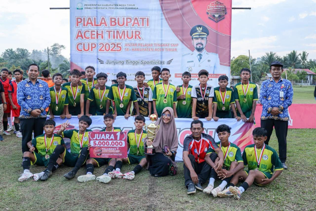 Aceh Timur — Turnamen sepak bola Piala Bupati Aceh Timur tingkat SMP resmi berakhir dengan kemenangan gemilang tim SMPN 1 Idi Rayeuk. Dalam partai final yang berlangsung di Lapangan Seuneubok Peusangan, Senin sore (10/11/2025), mereka menundukkan lawannya SMP N 2 Idi Timur dengan skor telak 5–0.
